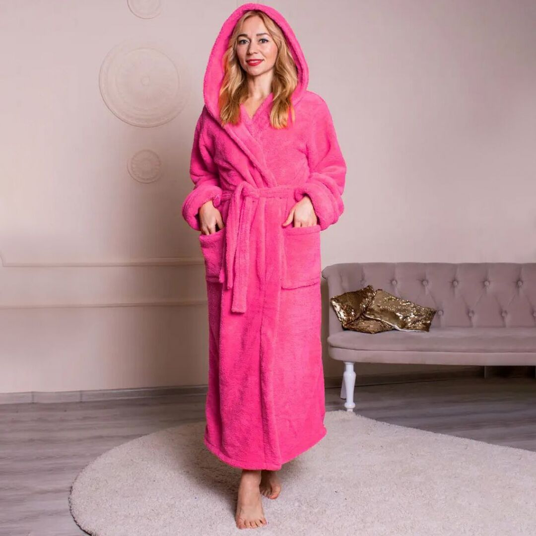 “ЛІНДА” – довгий жіночий махровий халат з капюшоном та двома кишенями.