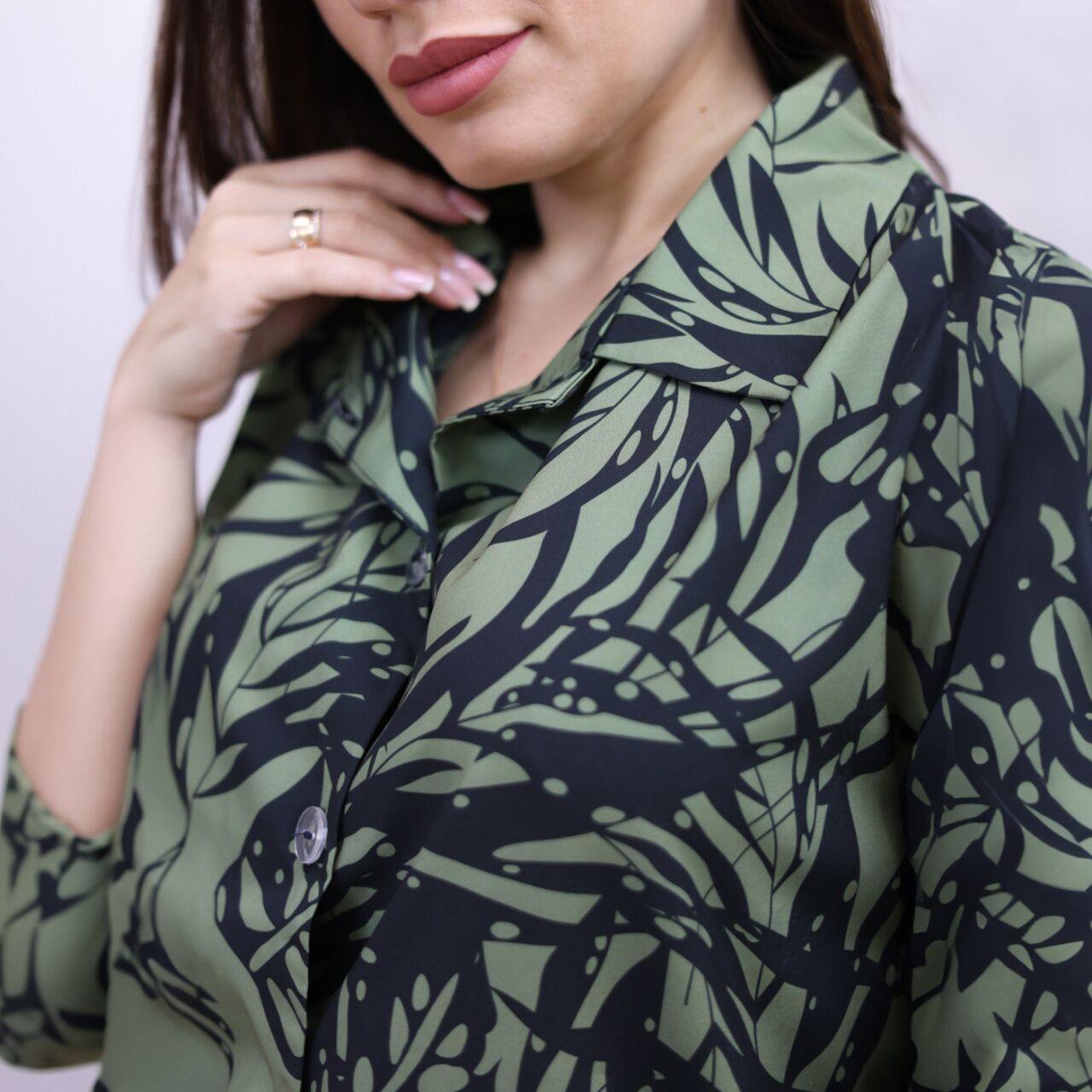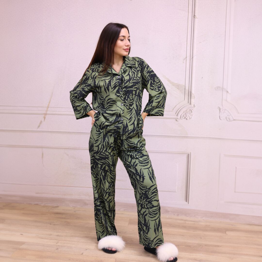 Комплектація – сорочка у вільному крої з рукавом 3/4, елегантності виробу надає комір та гудзики, а також широкі штани на резинці з карманами.
