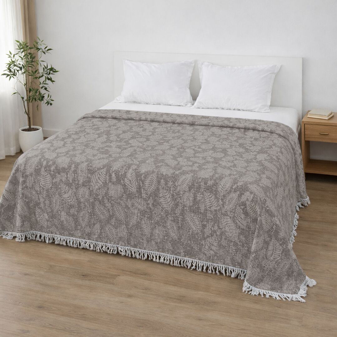 Вишуканий візерунок додає глибини та характеру, а бахрома по краях створює відчуття затишку з легким акцентом у стилі boho. Таке покривало стає не просто текстилем, а стильним елементом інтер’єру.