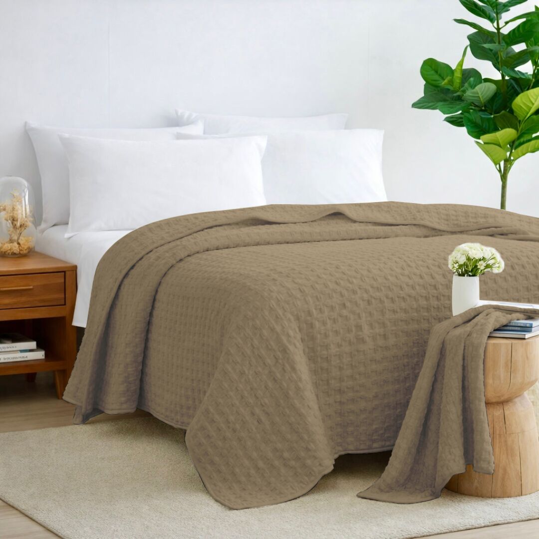 Вафельне покривало створене для тих, хто цінує натуральність і практичність. Особлива текстура тканини не лише виглядає стильно, а й забезпечує відмінну повітропроникність, дозволяючи шкірі дихати навіть у спекотні ночі.