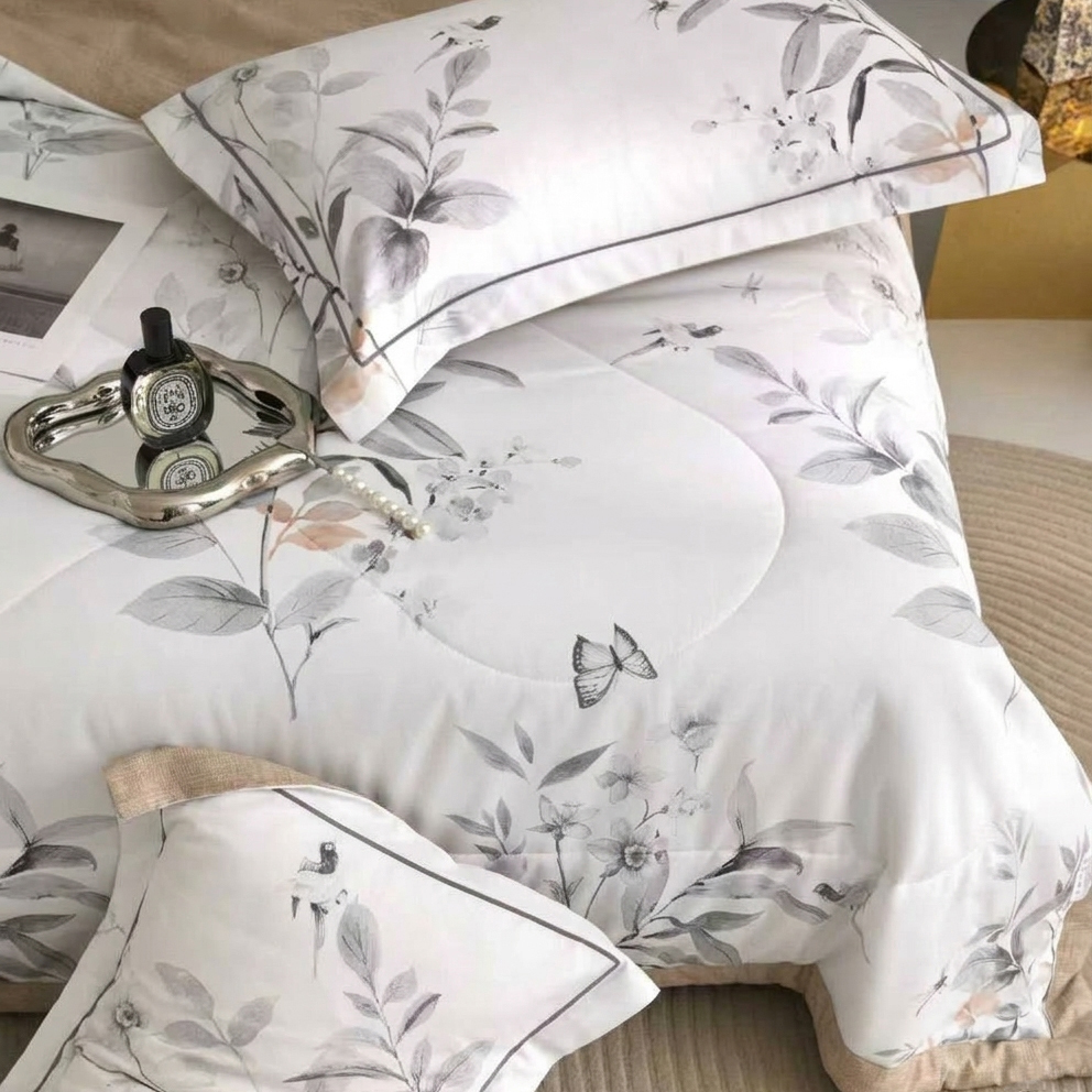 Комплект виготовлений із сумішевого сатину, який поєднує натуральну бавовну та сучасні волокна віскози. Завдяки цьому тканина м’яка, гладенька, приємна на дотик, добре пропускає повітря та довго зберігає охайний і бездоганний вигляд. Всесезонна стьобана ковдра з легким наповнювачем створює комфортний мікроклімат під час сну, забезпечуючи затишок у будь-яку пору року.