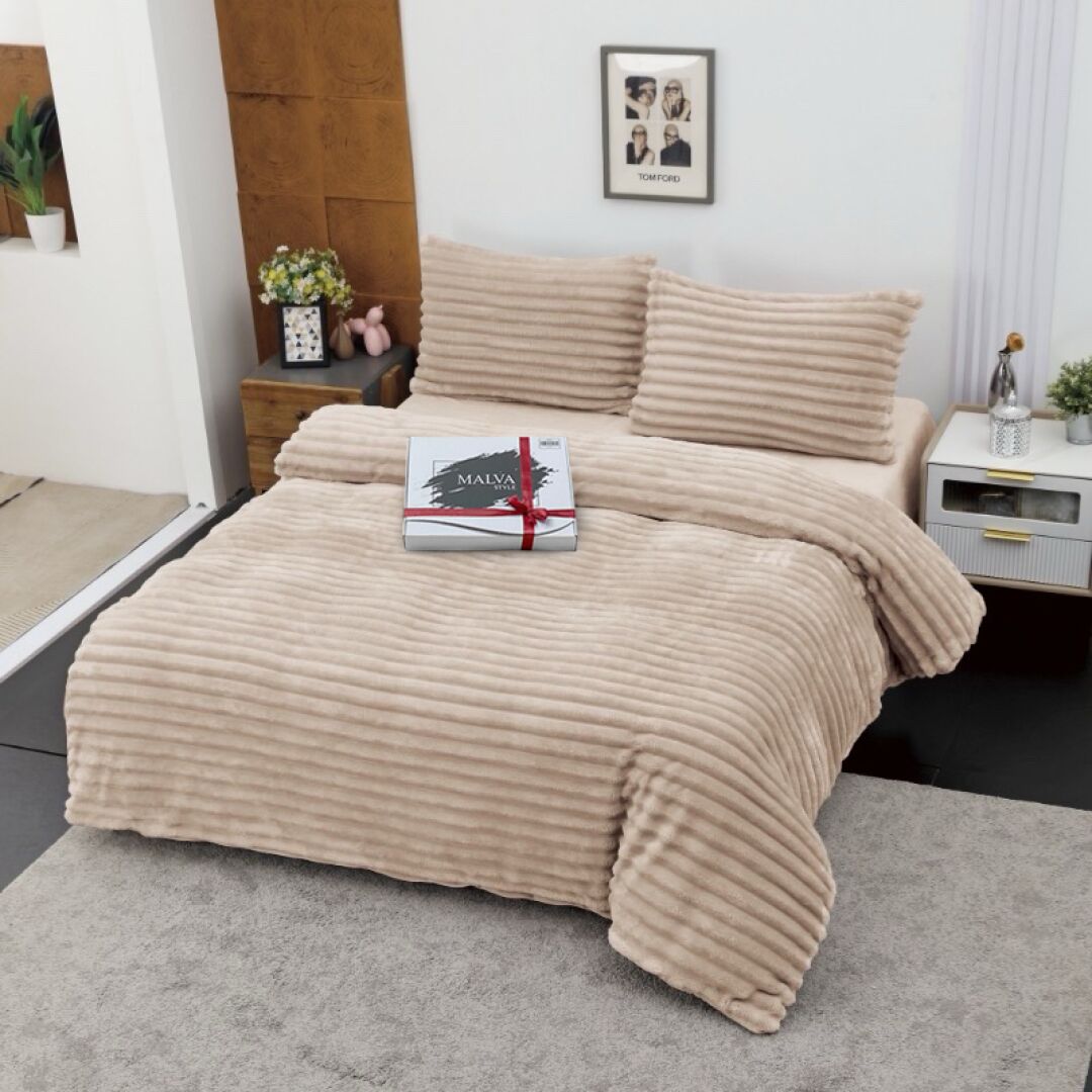 Дизайн такого комплекту також дуже цікавий, а саме ніжне гладке велюрове простирадло, підковдра на замочку з нижнього боку гладка, а зверху має структуру «рубчика» як популярні пледи і такі ж у рубчик наволочки з клапаном.