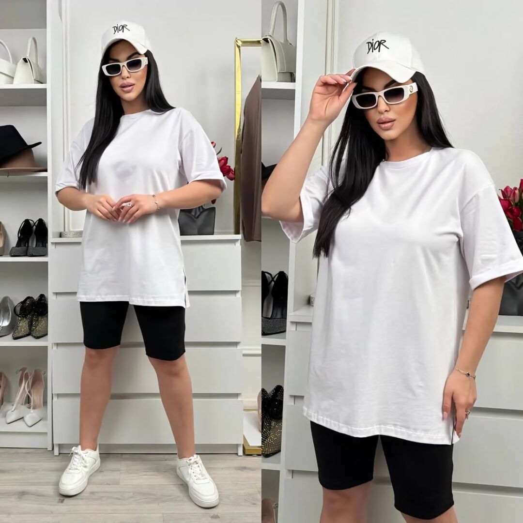 Комплектація у форматі вільної футболки в стилі оверсайз з опущеним рукавом, що придає стилю моделі.