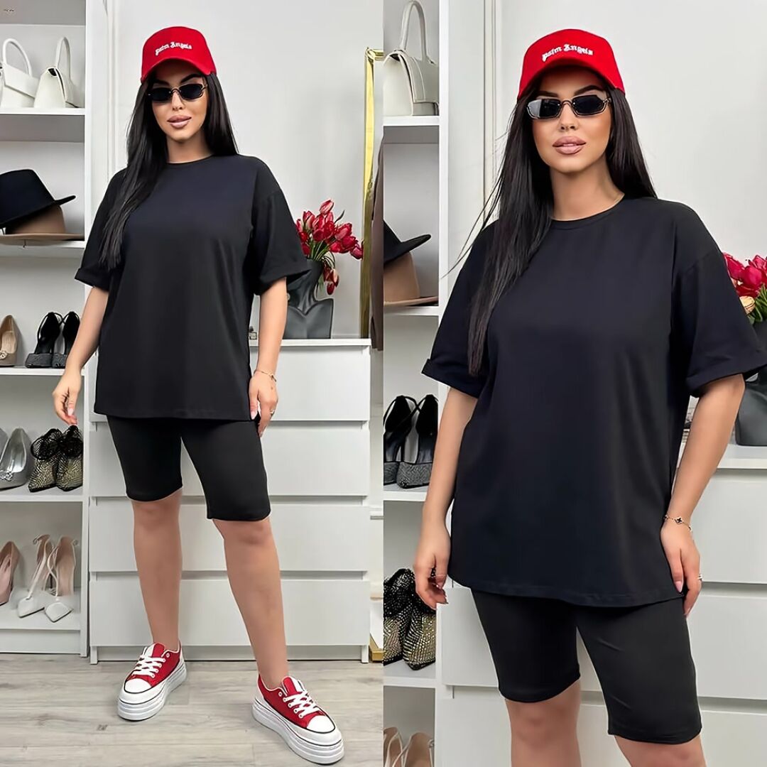 Комплектація у форматі вільної футболки в стилі оверсайз з опущеним рукавом, що придає стилю моделі.