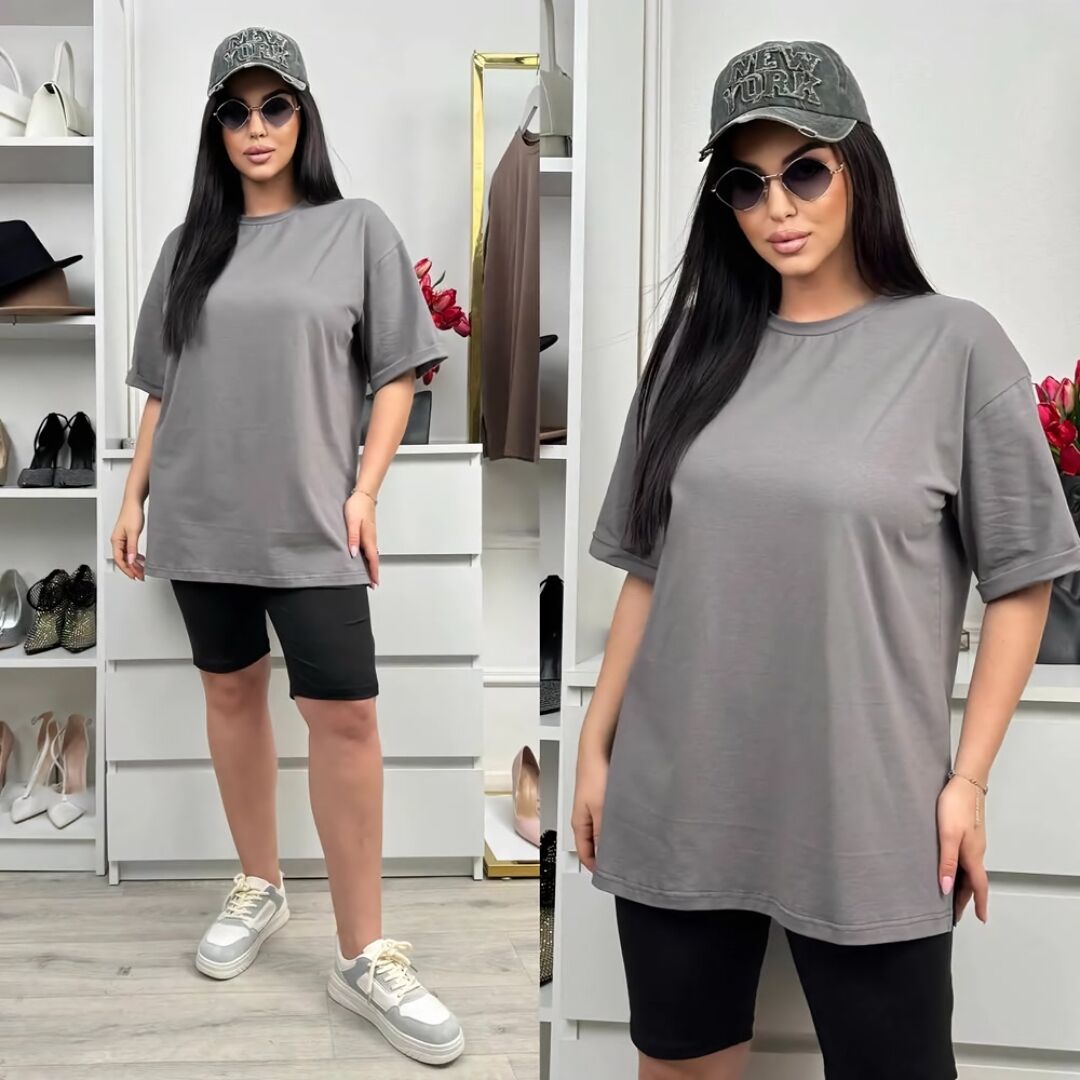 Комплектація у форматі вільної футболки в стилі оверсайз з опущеним рукавом, що придає стилю моделі.